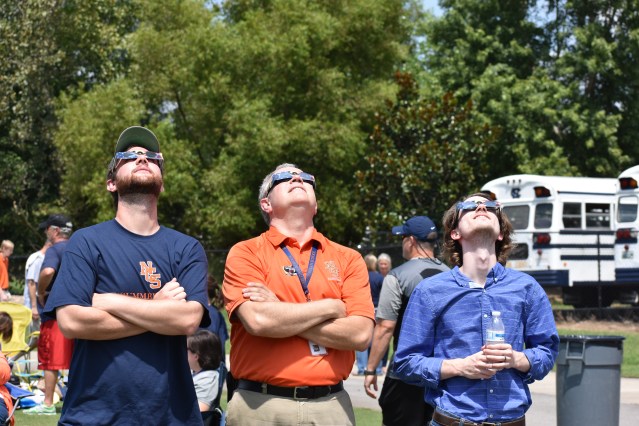 NCS faulty members Landry Smith, Kevin Green, and Caleb Goff safely watch the progress of the eclipse through their eclipse glasses.